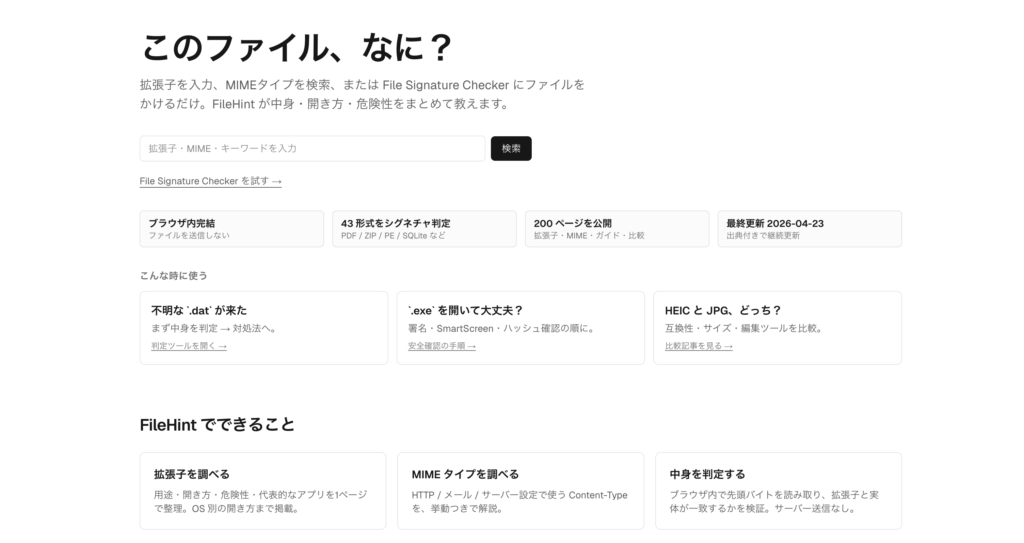 FileHintは、拡張子辞典、MIMEタイプ辞典、ファイルの中身を確認する診断、ガイド記事を組み合わせて、ファイルに関する不安を解消するために作りました。変換サービスやアカウント機能ではなく、調べる・確認する用途に絞っています。