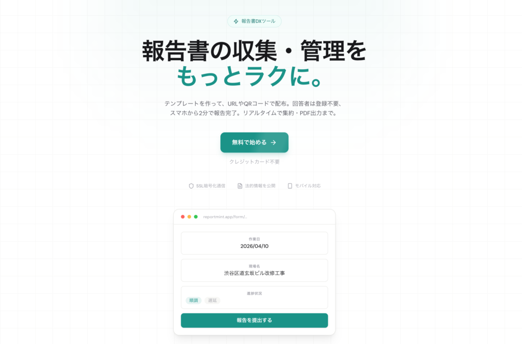 ReportMintは、報告書収集に目的を絞り、回答者にアカウント登録を求めない配布体験を重視しています。管理者側はテンプレート、提出状況、PDF・CSV出力を扱い、現場側はURLやQRから入力するだけの流れにしています。